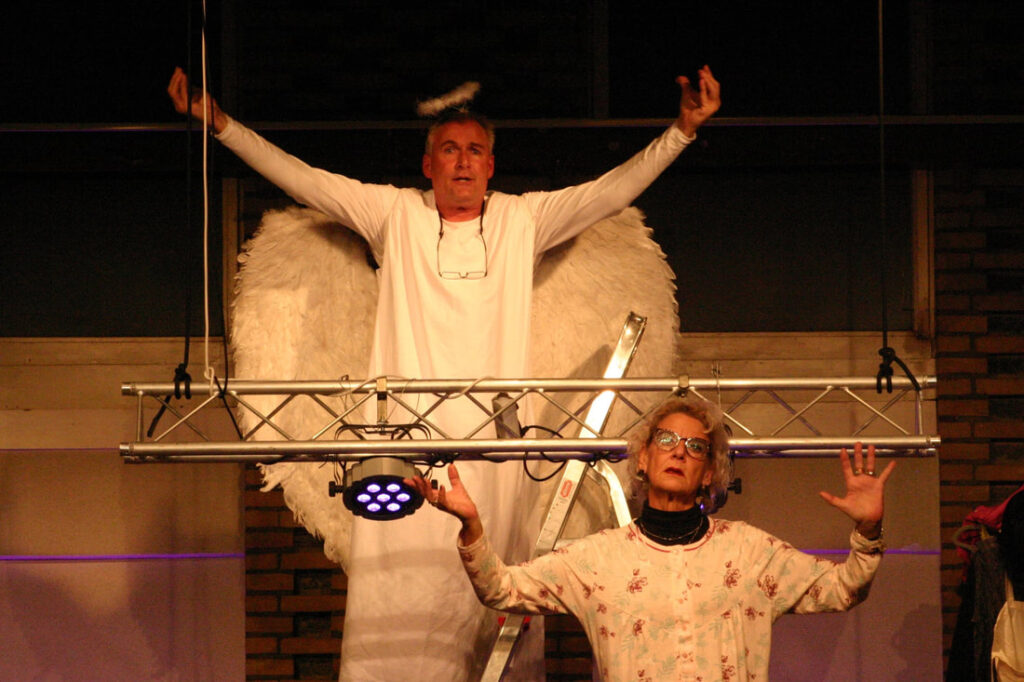 Arjo Lanser als de “down-to-earth” Tom (“jij denkt dat het publiek dat allemaal begrijpt?”) en Margaret Vreken die heel grappig de timide productieassistente Nelleke speelt die door iedereen als voetveeg wordt behandeld, zorgen voor muzikale ondersteuning en de decorploeg van de Rijzenspelers weet er met goed bedachte special effects een mooi geheel van te maken.