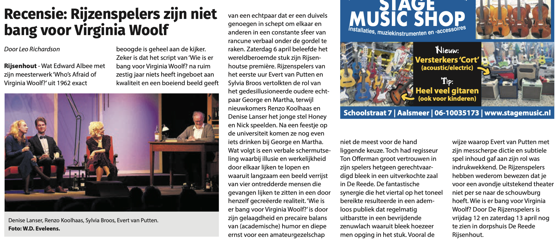 Door: Joop Kok. Wat Feyenoord afgelopen weekend was voor Rotterdam waren de Rijzenspelers in dit zelfde weekend voor Rijsenhout. Ze lieten een spel zien dat van begin tot eind fascineerde en waar je als dorpeling trots op was dat dit in jouw dorp toch maar even gebeurde. Het meest gespeelde en meest bekende toneelstuk van de twintigste eeuw, ‘Who is afraid of Virginia Woolf’, van Edward Albee (1928-2016) in de Nederlandse vertaling van Gerard van het Reve, op de planken in dorpshuis De Reede.