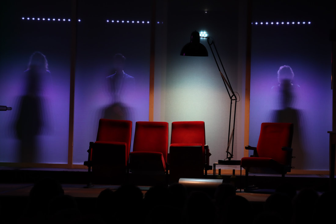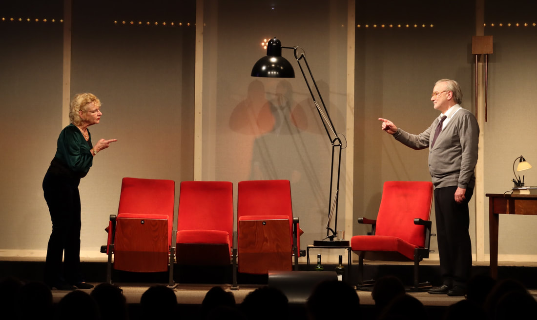 En toen begon het, het stuk dat ik al eerder had gezien in de uitvoering van Victor Löw en Linda van Dyck op de dag af twaalf jaar geleden in het Crown Theater en op tv als film met Liz Taylor en Richard Burton. Het decor riep een beeld van moderniteit op dat ik ken van de zestiger jaren, de tijd waarin het stuk is geschreven. De cleane achterwand van gespannen doorschijnend doek gaf ruimte voor het opvoeren van een schimmenspel en kon je als een verwijzing zien naar het onderliggende thema van het stuk: wat zie ik eigenlijk, wat is waar, wat is illusie? Toen Albee het schreef, was het tevens een aanklacht tegen valse romantiek, een poging om te laten zien dat de wereld een stuk minder mooi is dan we zouden willen. Onze hang naar illusie speelt ons daarbij constant parten. We laten ons maar al te gauw meeslepen door beelden die troost en houvast bieden. Het leggen van referenties is daar een onderdeel van. Neem die rode bioscoopstoelen op het podium, die staan er niet voor niets, ze refereren aan de film met Taylor en Burton. Dat gebeurde ook letterlijk. Zonder licht achter het witte doek kun je er prachtig op projecteren en dat gebeurde ook. Beelden uit de film met Taylor en Burton.